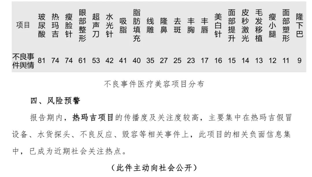 「报告期内,不良相关事件的医疗服务或产品,有热玛吉等等。」舆情报告指出,其中热玛吉居于首位,提醒美容就医者重点关注项目风险。