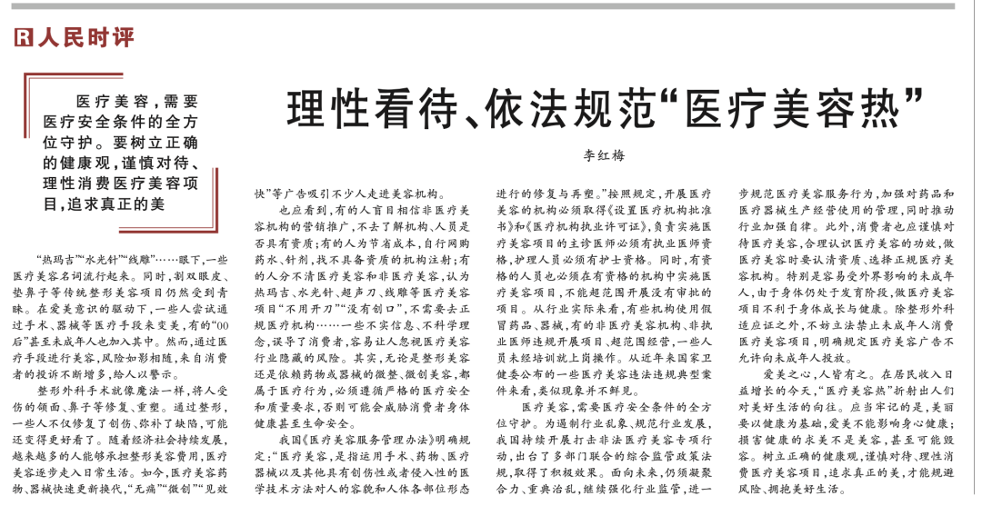 人民日报时评《理性看待、依法规范「医疗美容热」》图源:报纸截图