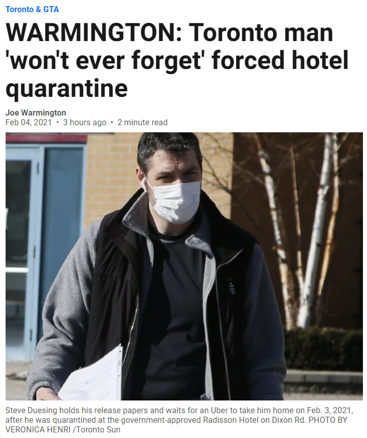 34的小伙Steve Duesing是多伦多士嘉堡的居民,他在去年圣诞节前夕出境去美国看女友,为了赶在3天$2000刀强制隔离措施生效前入境,他于上周日(1月29日)紧急返回多伦多。