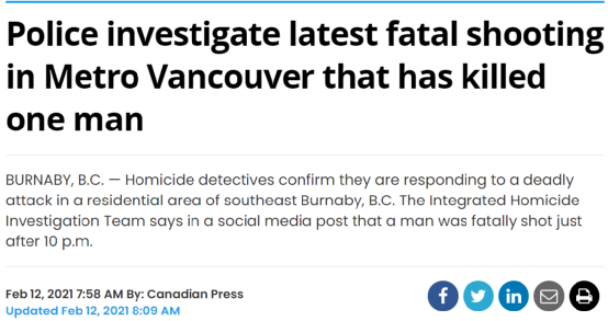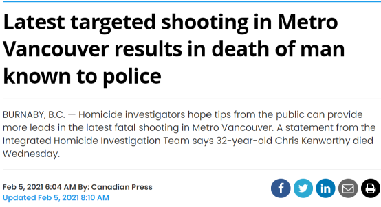 2月3日,又是本拿比东南部住宅区,32岁男子Chris Kenworthy坐在车里被人一枪打死,此人为警方熟知人士。