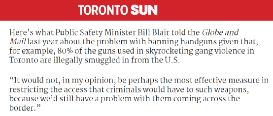 加拿大安全部部长Bill Blair在接受《环球邮报》采访时表示,就多伦多市而言,帮派分子火并用的武器,80%都来自美国,而不是加拿大。