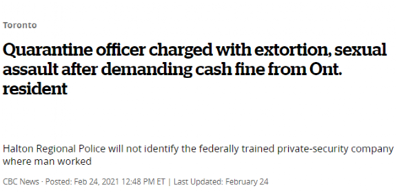 据CBC报道,一名安全警卫目前被指控在进行新冠隔离检查期间试图勒索和性侵妇女。安大略省荷顿(Halton)区警方称,犯罪嫌疑人曾受雇于一家加拿大公共卫生署(PHAC)指定的私人安保公司,此人目前已被停职。