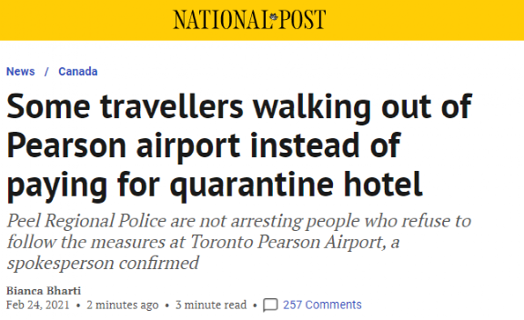 按联邦政府的规定,2月22日起,所有乘航班入境加拿大的旅客都必须在政府指定的酒店隔离三天等待落地核酸检测结果,可加拿大媒体《国家邮报》(National Post)2月24日曝出,部分从多伦多皮尔森机场入境的旅客,隔离酒店的账单也不付、罚款也不交,就这么直挺挺地走出了机场——然后该干嘛干嘛去。