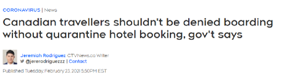 后来这事儿还出了个反转:Dawson的经历被CTV News一报道,给加拿大交通部知道了。当地时间2月23日,交通部在回复CTV的一封邮件中明确表示,“政府不要求航空公司核查旅客是否订到了加拿大政府指定的隔离酒店,对航空公司是否禁止旅客登机也不做要求”。