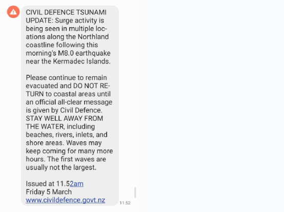 同时,第一波海啸已抵达新西兰部分地区,诸如奥克兰等重要城市将于当地时间5日中午12时左右迎来首波浪潮。据太平洋海啸中心的数据,抵达新西兰的第一波海浪高度从30厘米到1米不等。