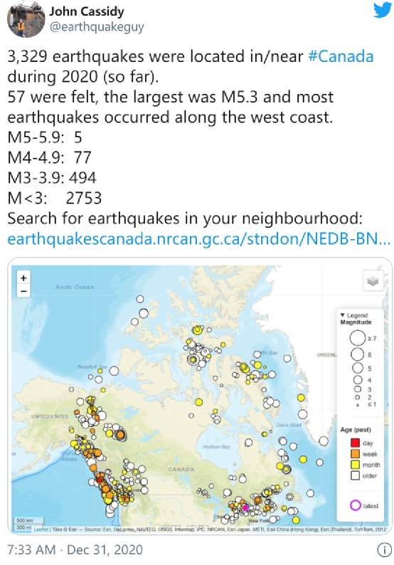 加拿大自然资源部2021年伊始曾发布报告称,2020年本国共记录了3300多次地震。别看数字大,这可是自1981年以来最平静的一年:小幅地震对释放地底能量没有任何意义。
