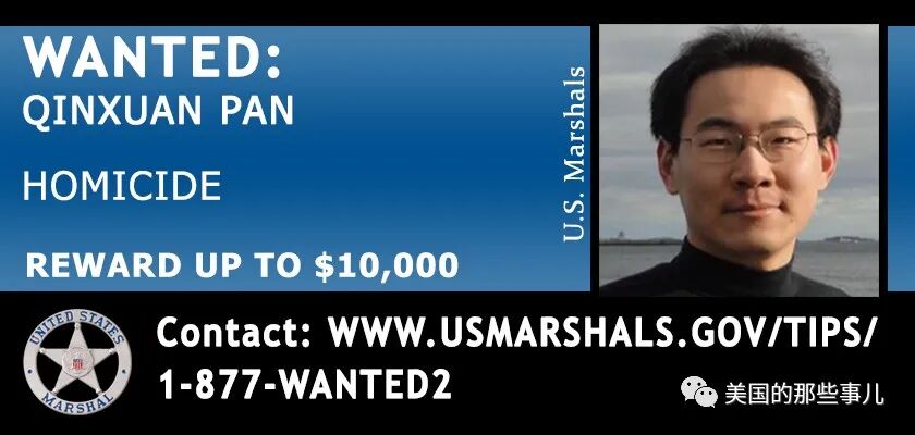据福克斯新闻今天(3月2日)报道,美国法警(US Marshals)表示,他们已在全美范围内扩大对杀害耶鲁大学华裔研究生的嫌疑人、麻省理工学院(MIT)的中国博士留学生潘勤轩(Qinxuan Pan,音译)进行追捕并对提供直接线索的人士悬赏1万美元。