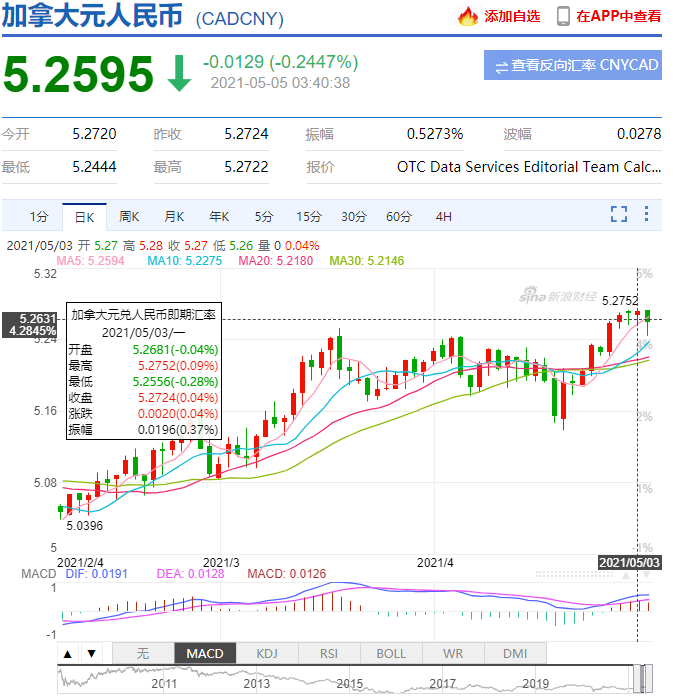 【加拿大乐活网lahoo.ca 亚瑟综述】2021年5月3日,加币与人民币的汇率节节攀升到达一年之内最高点5.27,虽然这两天汇率稍稍有点回落到5.25,但仍是处于高点,短期内汇率还是会飙升。