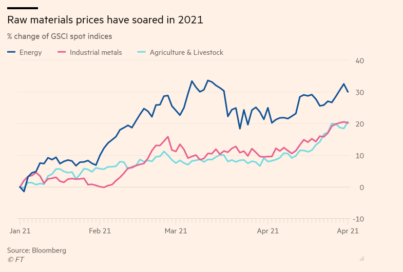 与此同时,全球最重要的工业金属铜价自2011年以来首次突破1万美元大关,而大豆价格则触及8年高点。追踪24种原材料价格变动的标普GSCI现货指数2021年以来上涨了21%。