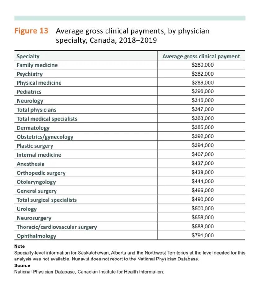 CIHI加拿大卫生信息研究所(Canadian Institute for Health Information)的数据显示:在2018到2019年间,加拿大注册医师的平均年薪为34万7000刀,相当于184万元人民币。