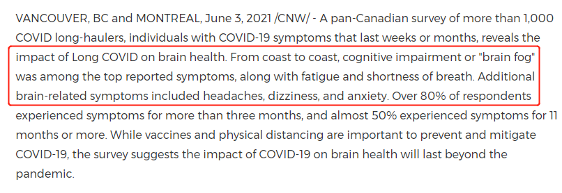 加拿大新冠久病者超多!近半患者症状持续11个月以上2021-06-08 |作者: | 来源:加国君加拿大新冠Loading...分享:#加拿大#后遗症#新冠 感染新冠病毒最怕重症和死亡,但其实久病不愈这种情况也非常可怕。加拿大刚刚公布的一项最新研究显示,加拿大人非常多人都遭受着新冠病毒感染后迟迟不能治愈的痛苦。而且这些人中有近半数症状持续长达11个月以上。 据Narcity报道,加通社消息,一项6月3日公布的最新新研究揭示了加拿大人出现的长久COVID-19病毒感染症状。 该研究由Viral Neuro Exploration(VINEx)、加拿大COVID Long Haulers Support Group和Neurological Health Charities Canada (NHCC)三个机构共同主导进行。 来自加拿大各地的1,048名年龄在18至90岁之间的受访者接受了调查。 在回答调查问卷的长期患者中,有超过80%的人症状持续出现超过三个月,近50%的人表示他们的症状持续了11 月或更长时间。 报告中最多的症状包括:脑雾(大脑突然失忆,、注意力无法集中)、疲劳和呼吸急促。其他常见症状是头痛、头晕和焦虑。 该研究特别关注 COVID-19 对大脑健康的长期影响。新闻稿说:“虽然疫苗和身体距离对于预防和减轻 COVID-19 很重要,但调查表明 COVID-19 对人们大脑健康的影响将持续到大流行之后。” 调查数据显示,近一半的受访者因长期反反复复的 COVID-19 症状而接受过5次以上的医疗护理。事实上,近三分之一的受访加拿大人表示,他们接受过10次以上的医疗护理。 新闻稿指出:“由于长期感染新冠病毒,每10人中就有6人不得不休假数周或数月,有的甚至导致提前退休。” 这份研究还指出,目前估计有25-35%的COVID-19患者正在经历该病毒的长期影响。 阅读 未经允许不得转载:加拿大乐活网 »加拿大新冠久病者超多!近半患者症状持续11个月以上分享: