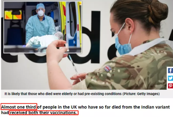 更可怕的是,英国公共卫生署(Public Health England, PHE)的一份新报告显示,在目前已知因Delta变种死亡的英国居民中,已经接种过两剂疫苗的死者人数占死亡病例的29%。