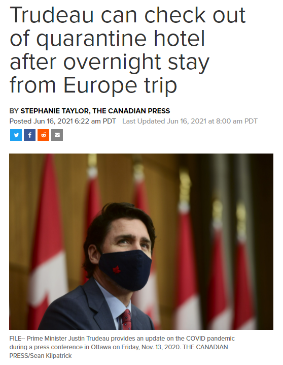而且,联邦政府还表示,该政策及其他一系列边境限制措施对减少新冠境外输入病例“非常有效”——有效你倒是照着做啊!作为政府首脑的特鲁多,强制隔离连程序都不走完就大大咧咧地放出风声说自己马上能回家了,这简直就是一记响亮的耳光抽在自己脸上。