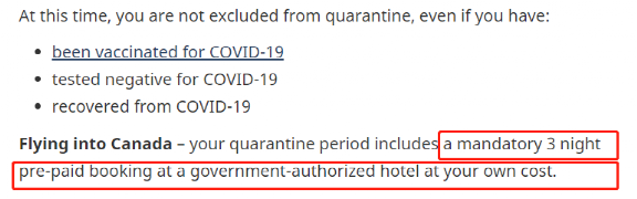 到现在,加拿大联邦政府官网上还明文写着,经空陆入境加拿大的旅客就得强制在指定旅馆待3个晚上。网站上还特别强调,就算你已经打完了两针疫苗,就算你的新冠检测结果是阴性,哪怕你得了新冠已经痊愈了,也得老老实实被关3天。