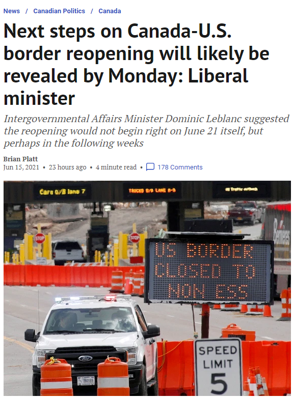 据《国家邮报》6月15日报道,加拿大政府间事务部部长Dominic Leblanc当天暗示称,联邦政府大概率将在6月21日宣布有关美加边境重开的计划。那天正好也是美加边境封锁到期的最后一天,但Leblanc部长称,联邦政府当天就打开边境的可能性非常低,很可能再等几周(也就是7月)就开了。