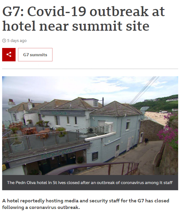 更别提特鲁多本人自己就有可能是新冠病毒的密切接触者——在离G7峰会主会场不远处的一处旅馆,这里住着该会议的媒体和安保人员。而这个旅馆在英国当地时间6月11日(G7峰会的第一天)被BBC曝出“有相当一部分人新冠确诊呈阳性”——媒体、安保,哪个会离特鲁多这种领导人很远?