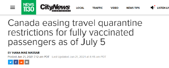 从加拿大东部时间2021 年 7 月 5 日晚上 11:59 开始,完全接种四种指定疫苗的加拿大人和永久居民将取消隔离检疫要求和8天后的测试。目前,加拿大政府接受的疫苗只有四款:辉瑞、莫德纳、阿斯利康和强生。