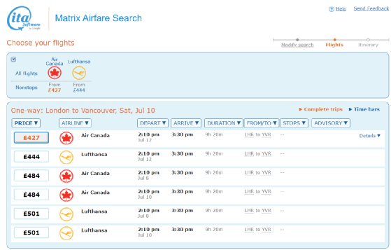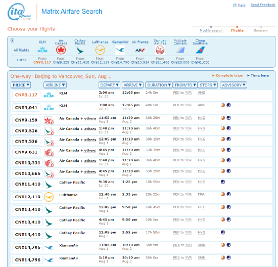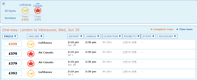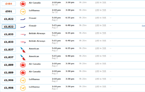 以伦敦到温哥华的机票为例,可以看到,6月底 的票价为300多英镑,到了7月上旬都变成了400多和500多英镑。到了八月初们更是直线飘升到1000多磅。