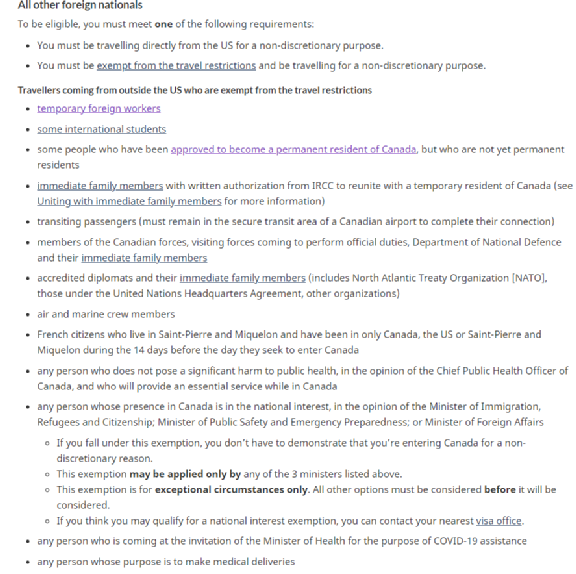 (目前可入境加拿大的外国公民条件 图自加拿大联邦政府官网)