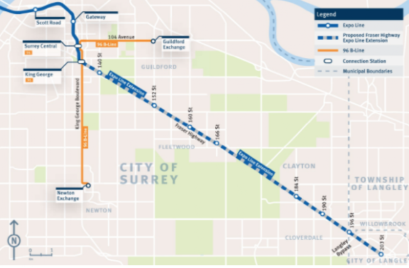 据了解,这条即将新建的现有世博线(Expo Line)延长线总长约16公里,西起素里市的乔治国王站(King George Station),东至兰里市中心的203街。