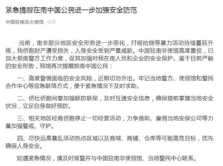中国驻南非共和国大使馆也发布了紧急提醒,要求中国公民加强安全防范。