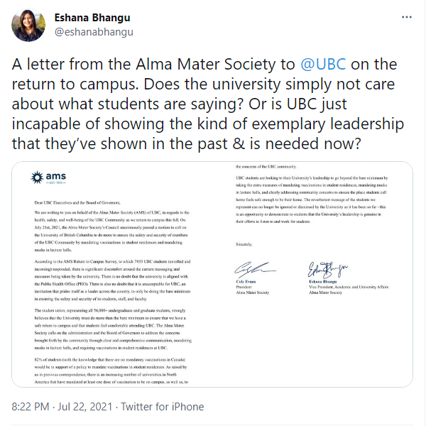 而这也引起了大批学生的强烈不满!甚至有的学生表示,如果保持这样的政策,自己将会休学一个学期。代表56,000名学生的UBC Alma Mater Society协会已经正式致信UBC的学校教育局和管理层,要求他们对学生和工作人员负责。在信中,AMS主席COle Evans和副主席Eshana Bhangu表示,UBC的管理层已经逾越了BC省的COVID-19防疫指南。信中写道:“毫无疑问,大学与公共卫生厅应该是一致的。作为一个全国领先的大学,UBC在确保学生、教职员工安全方面只做最低限度的工作,这令人难以接受。”