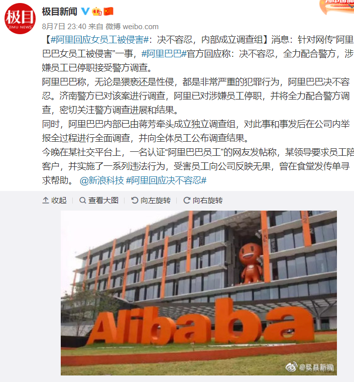 针对网传“阿里巴巴女员工被侵害”一事,阿里巴巴官方回应称:决不容忍,全力配合警方,涉嫌员工已停职接受警方调查。