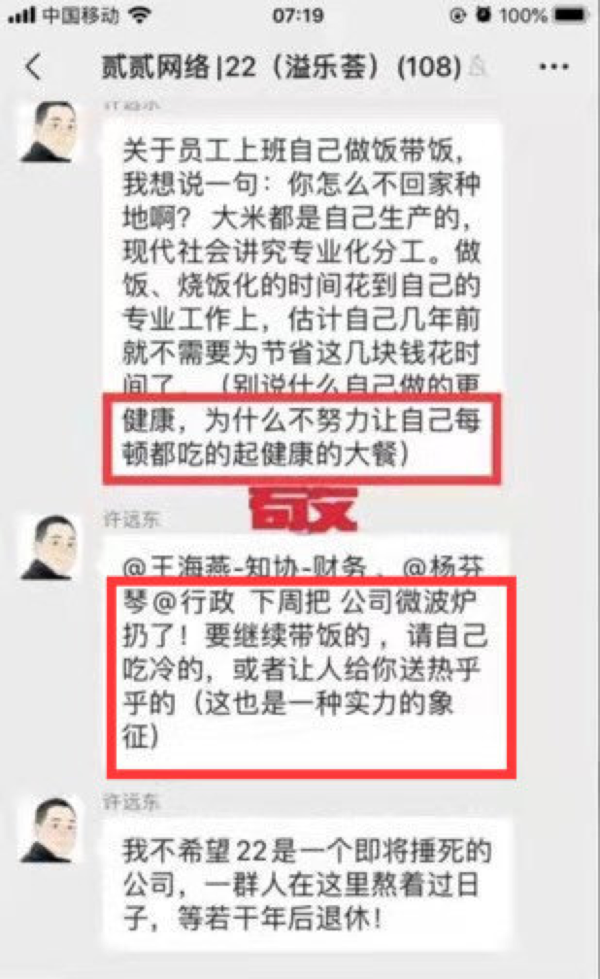 关于许远东的做法,网友们几乎是一边倒的予以“差评”!有网友表示:“有实力的老板一般给员工免费提供午餐,而不是扔热饭用的微波炉。”还有网友担心,万一有些有糖尿病等需要自己准备“特餐”的员工,不让在公司热饭对他们来说是不是有些不近人情,是一种伤害呢?对此,你怎么看呢?