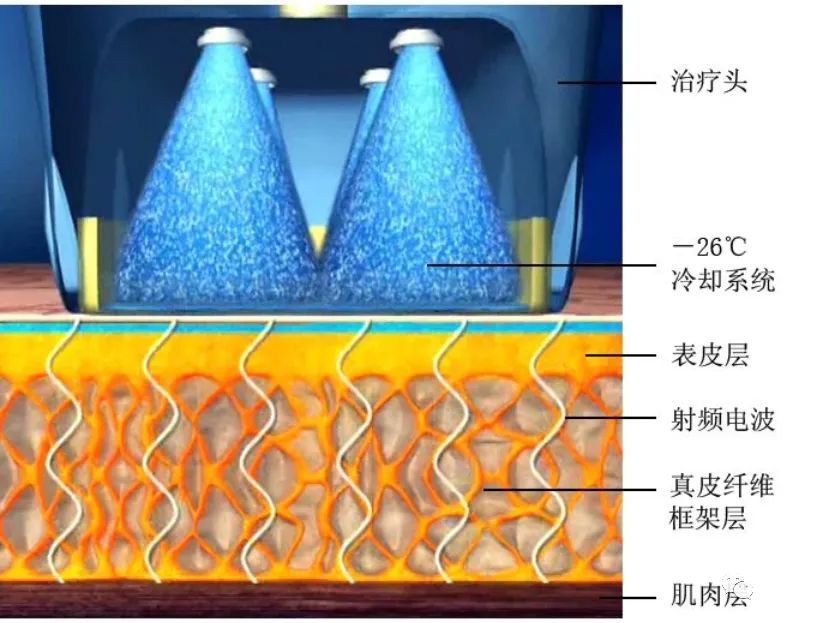 原理:用射频电流加热真皮层的胶原蛋白和弹性蛋白,使其收缩、变性,并促进生成新的胶原蛋白、胶原纤维和弹性纤维。