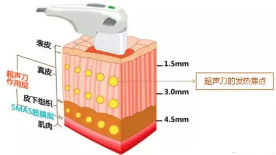 超声刀的治疗头有三种:1.5mm适用于真皮浅层——去皱;3mm适用于真皮深层——紧致;4.5mm适用于筋膜层——提升,可谓精准打击。