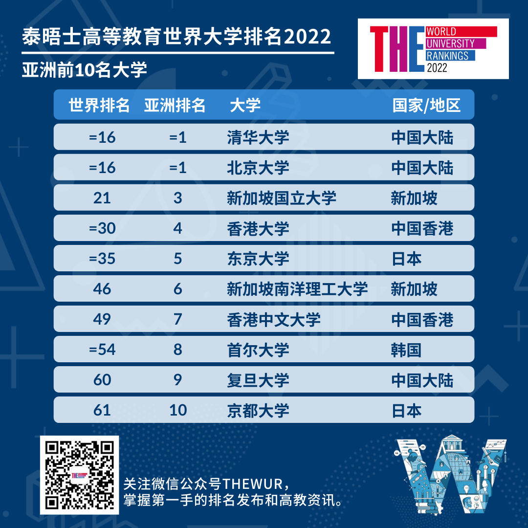 另外,中国共五所高校跻身亚洲Top10,清华大学和北京大学并列世界第16,亚洲第1;香港大学、香港中文大学、复旦大学也取得好成绩;新加坡国立大学亚洲第3,世界第21。