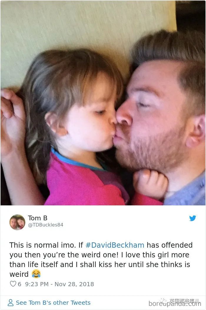 “这不是很正常,如果贝克汉姆冒犯你了,说明你是那个怪人!我爱我女儿胜过自己的生命。我会一直亲她直到她不想亲了为止。”