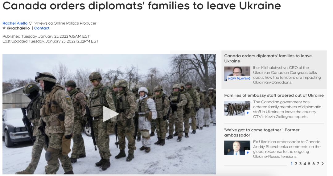 今天,CTVnews报道称,加拿大政府已经下令在乌克兰工作的外交人员及其家属撤离,但目前大使馆工作人员仍将留在那里。