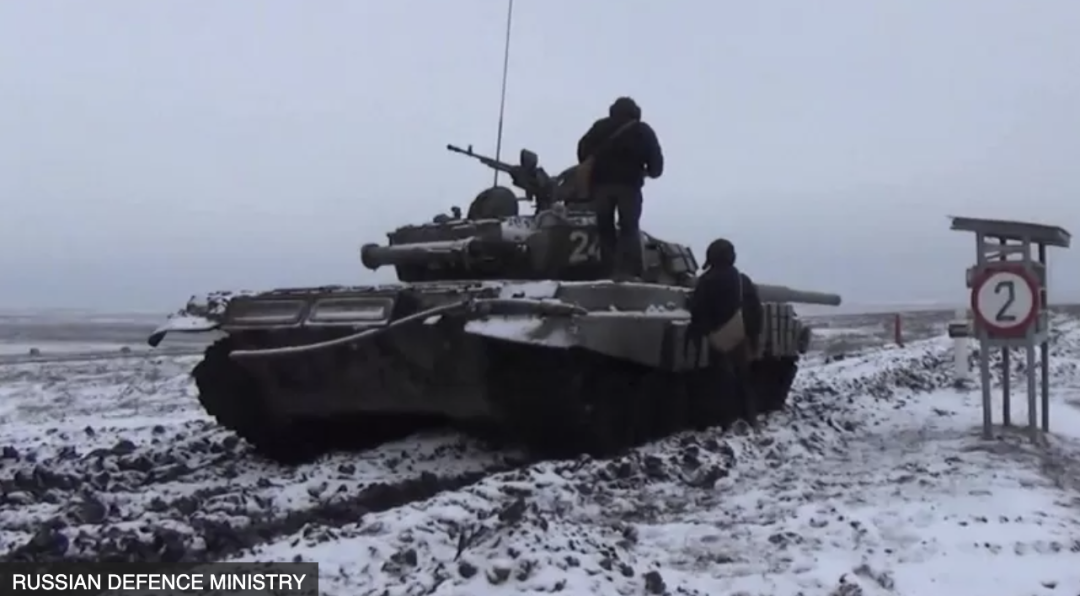 俄罗斯电视台展示该国坦克在乌克兰边境演习。图源:BBC