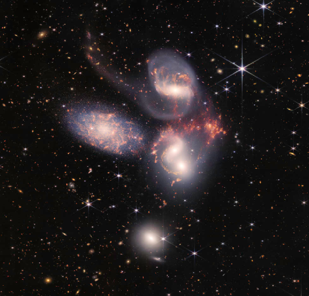 下图的现象被称为“斯蒂芬五重奏”(Stephan’s Quintet)。这是五个星系在2.9亿光年外缠绕“舞蹈”的奇妙景象。上一次观测到类似的景象是在斯蒂芬五重奏出现在飞马座附近。