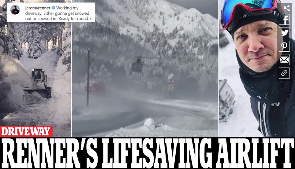 两次获得奥斯卡提名,在漫威多部电影中扮演“鹰眼”(Hawkeye)的杰瑞米•雷纳,昨天在内华达州北部铲雪时突然遭遇重大事故,目前已经被紧急送医,伤势严重。