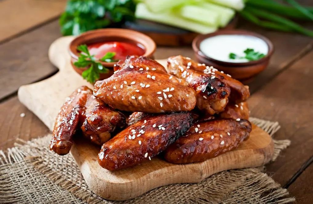 这里的客人都能享用一磅腌制的鸡翅,轻轻油炸并涂上甜辣椒蒜酱!