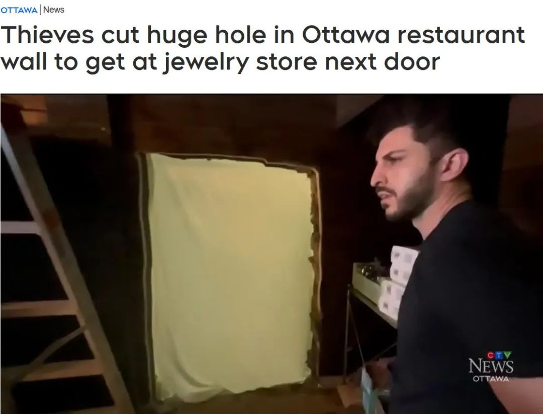 渥太华警方表示,从目前的调查来看,这起入屋盗窃案件发生在一家餐馆,窃贼们挖洞潜入隔壁的珠宝店 Le’s Jewellery,目标自然是店内价值连城的各种珠宝,使隔壁珠宝店损失严重。