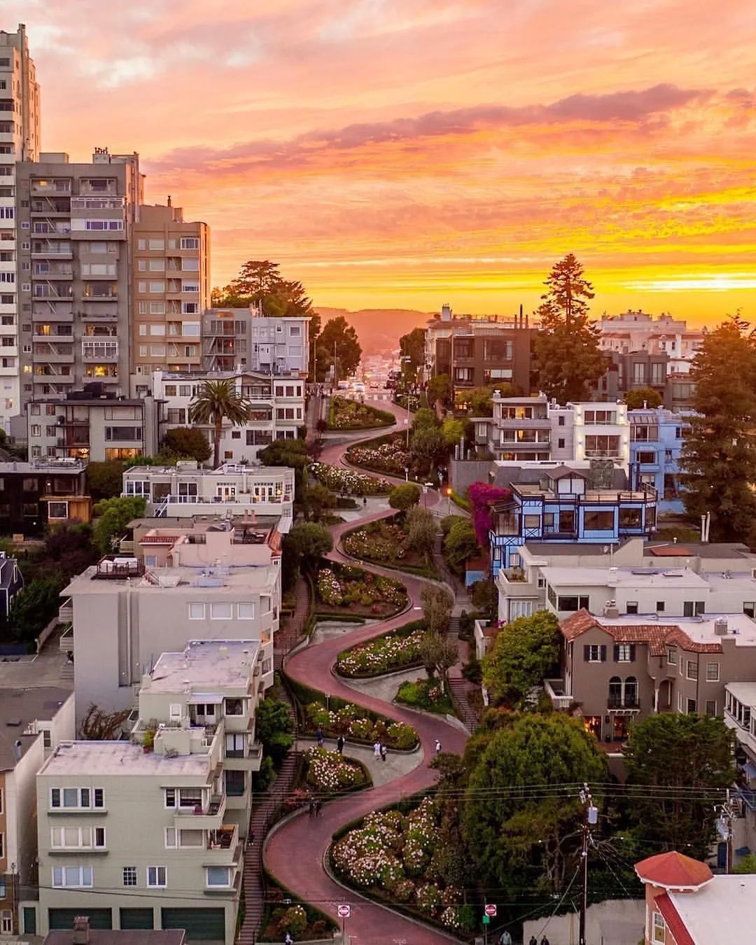 作为旧金山最美的景点之一,街道最高处可远眺海湾大桥和科伊特塔。车子只能向下单行,顺花街两侧步道可尽情漫步欣赏美景。