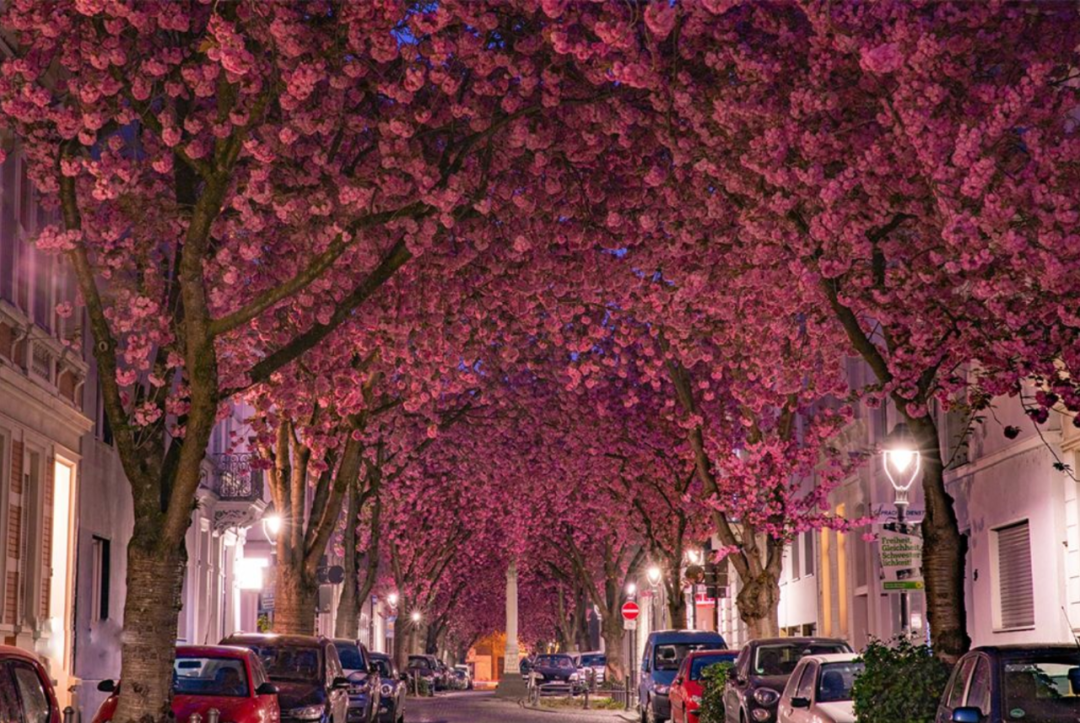 德国波恩老城区,有一条著名的赫尔斯特拉斯樱花大道,每年3-4月间,这个H型街区两旁樱花朵朵,迎春怒放,如云似霞,满树烂漫的欧式情怀。