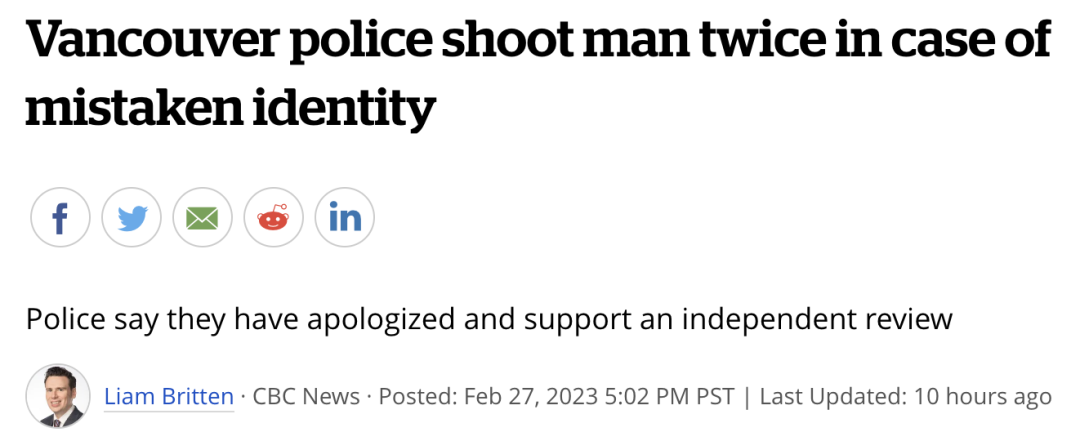 温哥华警方目前正在向一名普通民众道歉,道歉的理由很奇葩,因为警方认错了人!导致这名男子被橡皮子弹击中两次,还莫名其妙被逮捕。