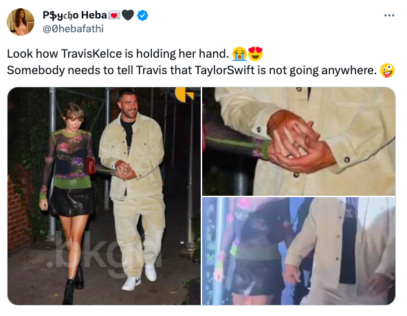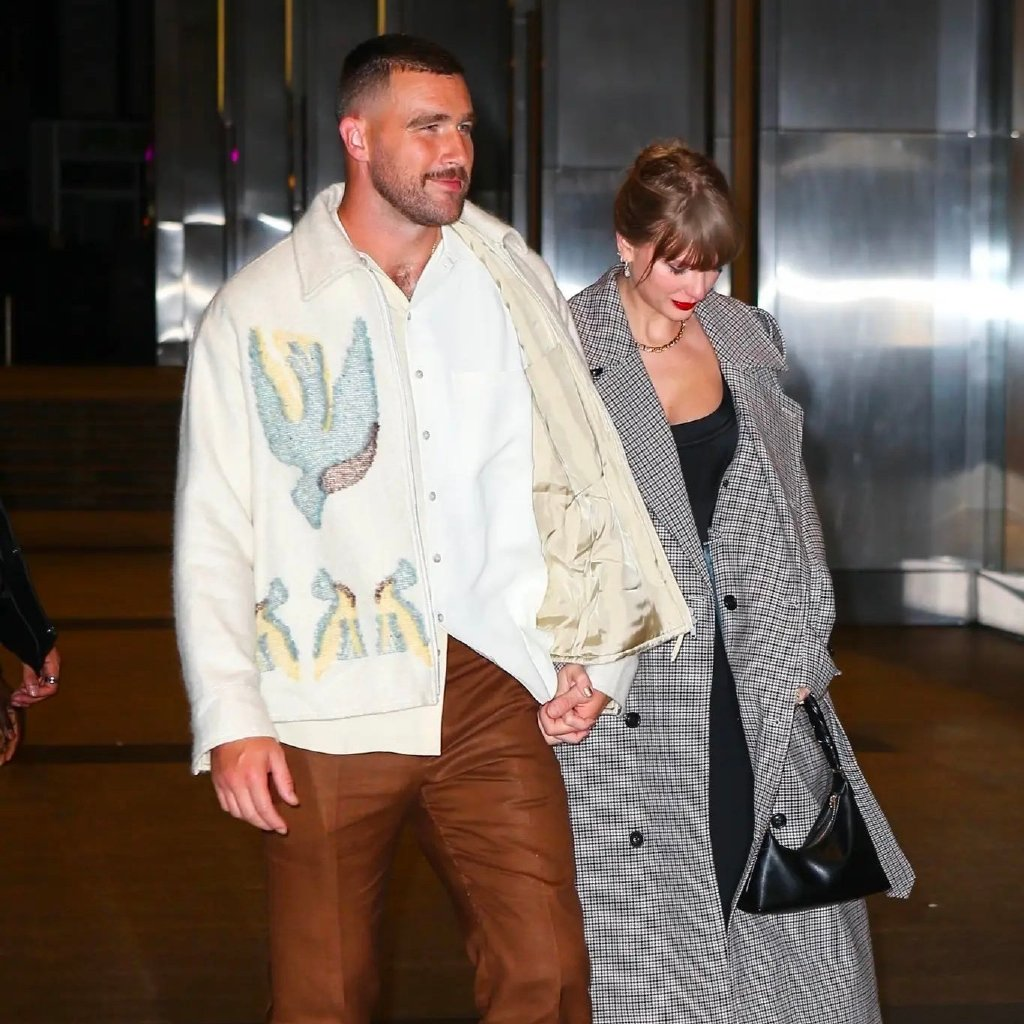 这是自上个月霉霉出现在堪萨斯城的箭头体育场观看美式橄榄球赛时,被曝出与正在台下比赛的NFL酋长队的近端锋、橄榄球明星特拉维斯·凯尔斯Travis Kelce的新恋情后,他俩的第一次公开牵手上街,所以也算是他们的正式官宣照吧!